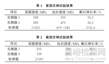 高溫拉伸試驗(yàn)結(jié)果如表2所示,可知在高溫環(huán)境下,管道的屈服強(qiáng)度為196~201MPa,抗拉強(qiáng)度為265~280MPa,斷后伸長率為28.5%~37.0%,滿足GB/T 5310—2017的規(guī)定,但屈服強(qiáng)度較低且接近標(biāo)準(zhǔn)規(guī)定下限,說明球化對(duì)材料的高溫力學(xué)性能有較大影響,原因是球化珠光體導(dǎo)致材料的屈服強(qiáng)度降低,在熱力學(xué)驅(qū)動(dòng)力的作用下,球化珠光體的片層間距增大,晶粒尺寸變大,晶界總長度減小,晶界強(qiáng)化作用減弱;碳化物的析出導(dǎo)致固溶強(qiáng)化效果減弱,不斷聚集長大的碳化物引起局部應(yīng)力集中,最終導(dǎo)致材料的高溫抗拉強(qiáng)度、屈服強(qiáng)度降低。
