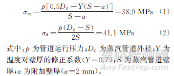 蒸汽管道直管段的內(nèi)壓應(yīng)力(σeq)和環(huán)向應(yīng)力(σθ)的計(jì)算方法分別如式(1)~(2)所示。