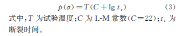根據(jù)高溫持久強(qiáng)度性能測試數(shù)據(jù)分析,采用L-M參數(shù)[p(σ)]方程建立壽命評(píng)估模型,計(jì)算該蒸汽管道的剩余壽命,該方法是已普遍應(yīng)用且相對(duì)可靠的剩余壽命評(píng)估方法。12Cr1MoV鋼的L-M參數(shù)方程如式(3)所示。