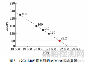 表3為不同試驗(yàn)應(yīng)力(σ)下主蒸汽管道的斷裂時(shí)間,通過試驗(yàn)應(yīng)力-試驗(yàn)溫度-斷裂時(shí)間之間的關(guān)系得到p(σ)-σ擬合曲線(見圖3)。