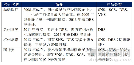 相比于國外市場,中國的神經調控市場競爭格局還處于發(fā)展初期,從注冊證上來看,國家藥監(jiān)局批準的創(chuàng)新醫(yī)療器械主要是北京品馳和蘇州景昱醫(yī)療。除了景昱醫(yī)療和品馳醫(yī)療外,其他國內廠商則圍繞胃腸疾病、膀胱功能障礙、糖尿病、疼痛、神經系統(tǒng)損傷、運動功能障礙等領域展開了探索。