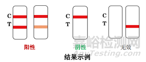 陽性:兩條紅色或紫色條帶出現(xiàn)。一條位于檢測區(qū)(T)內(nèi),另一條位于質(zhì)控區(qū)(C)內(nèi)。檢測區(qū)(T)條帶顏色可深可淺,均為陽性結(jié)果。