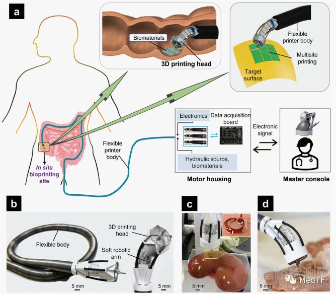 F3DB一種微型靈活的 3D 生物打印機(jī),它能夠像內(nèi)窺鏡一樣插入體內(nèi),并將多層生物材料直接輸送到內(nèi)部器官和組織的表面,實(shí)現(xiàn)組織或者器官重建。