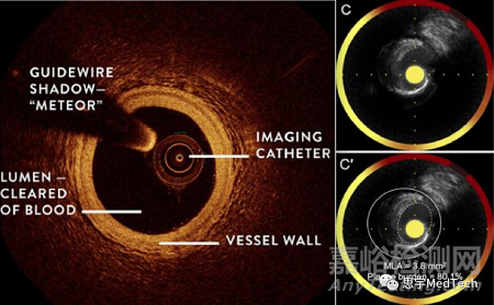 據(jù)稱,HyperVue 是第一個(gè)結(jié)合了光學(xué)相干斷層掃描DeepOCT™(下圖左)和近紅外光譜(NIRS)(下圖右)這兩種重要成像技術(shù)的系統(tǒng),以提高導(dǎo)管插入術(shù)實(shí)驗(yàn)室的圖像質(zhì)量和手術(shù)效率。OCT可以顯示管腔和血管壁內(nèi)的結(jié)構(gòu),而NIRS能夠?qū)ρ鼙谶M(jìn)行光譜化學(xué)分析,以揭示高脂質(zhì)含量的區(qū)域,特別是可以識(shí)別與斑塊破裂相關(guān)的脂質(zhì)核心斑塊。