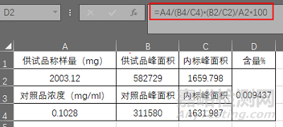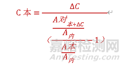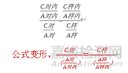 可避免因樣品前處理及進(jìn)樣體積誤差對(duì)測(cè)定結(jié)果的影響,又能排出基質(zhì)干擾。通常在氣相色譜中使用,標(biāo)準(zhǔn)加入內(nèi)標(biāo)法中,采用對(duì)照品峰面積/內(nèi)標(biāo)物峰面積,帶入外標(biāo)法公式計(jì)算即可,公式如下: