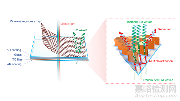 由于微波和光同屬電磁波,如何通過材料結(jié)構(gòu)設(shè)計來分離不同頻率電磁波的傳輸路徑是實現(xiàn)高性能透明屏蔽的關(guān)鍵。研究人員首先在微納尺度設(shè)計了具有“低占空比”及“大高寬比”結(jié)構(gòu)特征的微觀截止波導(dǎo)陣列來控制光與微波這兩種不同頻率的電磁波的傳輸特性。其中,高頻光信號可在微波導(dǎo)陣列腔體內(nèi)自由通過,而較低頻率的微波則會被微波導(dǎo)陣列衰減損耗。