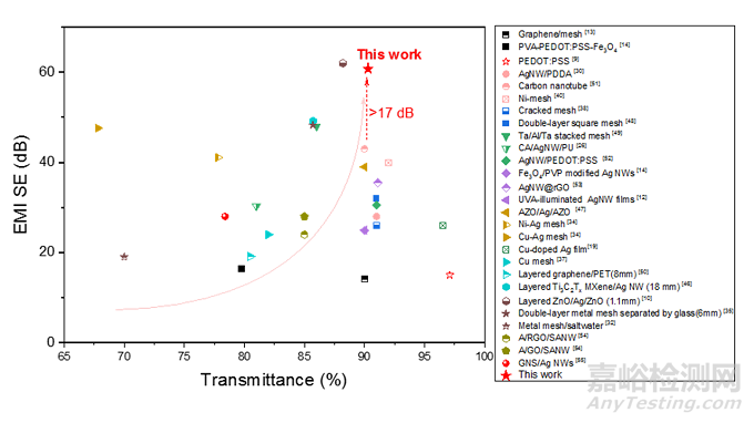 圖3.與已報道的各類透明電磁屏蔽材料綜合性能對比