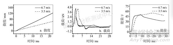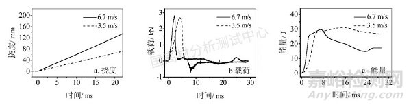 采用 ISO 6603-2 標(biāo)準(zhǔn),在相同能量 135 J 下,分別用 3.5 m/s 、6.7 m/s 的沖擊速度進(jìn)行試驗(yàn),得到不同沖擊速度下 ABS 各個時刻的撓度、載荷、能量的時程曲線,分別繪制出各個 參數(shù)的時間歷程圖。如圖2所示。