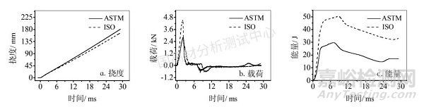 在相同能量 135J下,分別采用 ASTM D3763 和 ISO 6603-2 標(biāo)準(zhǔn)以 6.7 m/s 的沖擊速度 進(jìn)行沖擊試驗(yàn), 得到同一沖擊速度不同標(biāo)準(zhǔn)下 ABS 各個時刻的撓度、載荷、能量時程曲線, 分別繪制出了各個參數(shù)典型的時間歷程 。如圖 3 所示。