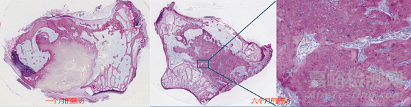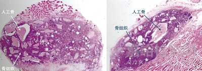 據(jù)臨床骨傳導案例顯示:兔股骨踝模型,亞甲基藍-堿性品紅染色,骨傳導效果出眾。在第一個月的隨訪顯示:人工骨的周圍已經(jīng)開始固化;在第六個月的隨訪顯示:大部分的固化幾乎全部完成。