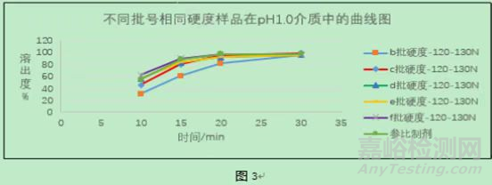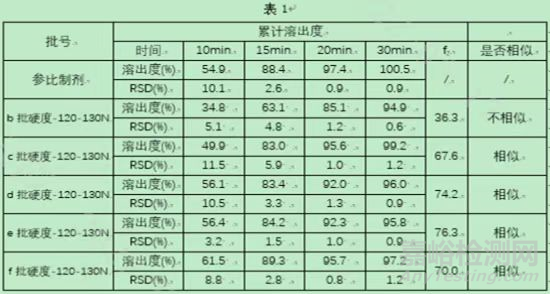 具體實(shí)例見(jiàn)表1、圖3,表1、圖3分別是是仿制藥A片劑壓片時(shí)壓制的多批相同的硬度樣品在pH1.0介質(zhì)中的溶出曲線數(shù)據(jù)和溶出曲線圖,從圖中可以看出,c、d、e、f樣品在介質(zhì)pH1.0中的曲線與參比制劑一致,而b樣品在介質(zhì)pH1.0中的曲線與參比制劑不一致;