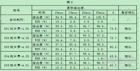 從表3和圖5中可以看出,隨著片厚的增大,溶出也逐漸增大,通過(guò)與參比制劑相似性的對(duì)比,可以找出與參比制劑相似的片厚范圍。