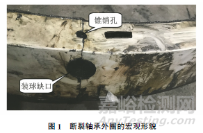 斷裂軸承外圈的宏觀形貌如圖1所示,發(fā)現(xiàn)軸承外圈出現(xiàn)貫穿斷裂或局部斷裂,并且軸承套圈斷裂位置非常一致,均位于外圈裝球缺口部位。