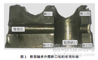 斷裂軸承外圈斷口處的宏觀形貌如圖2所示,可見斷口整體由4個(gè)獨(dú)立斷口組成,各獨(dú)立斷口斷裂源均分布在裝球缺口與錐銷孔交接的尖角附近,各斷口可見弧線狀疲勞輝紋,呈疲勞斷裂擴(kuò)展形貌。