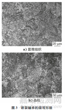 在軸承外圈裝球缺口與錐銷孔斷裂位置取樣,并進(jìn)行金相檢驗(yàn),結(jié)果如圖3所示,可見斷裂軸承的顯微組織為回火索氏體調(diào)質(zhì)組織,晶粒度等級(jí)為7.0級(jí)。
