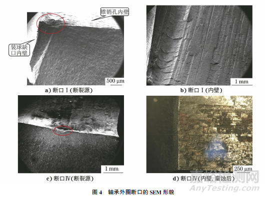 在軸承外圈斷口處截取試樣,并進(jìn)行SEM分析,結(jié)果如圖4所示,其中斷口Ⅱ和斷口Ⅲ的斷裂源因受到擠壓摩擦而被嚴(yán)重破壞。由圖4可知:斷口Ⅰ斷裂源位于孔壁摩擦塑性變形溝槽底部,斷口Ⅳ斷裂源位于孔壁腐蝕坑底部,斷口Ⅰ和斷口Ⅳ的斷裂源均位于錐銷孔的孔壁處,與裝球缺口的距離為0.5~1.5mm,斷裂源位置有明顯的金屬塑性變形和擠壓摩擦痕跡,呈溝槽狀[圖4a),4c)圓圈所示標(biāo)記位置為斷裂源位置];錐銷孔的孔壁有大量沿圓周方向分布的摩擦塑性變形痕跡,局部銹蝕明顯。