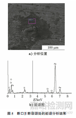 對(duì)斷口Ⅰ和斷口Ⅳ的斷裂源進(jìn)行能譜分析,發(fā)現(xiàn)斷口Ⅰ斷裂源處的化學(xué)成分為42CrMo鋼基體成分,未發(fā)現(xiàn)夾雜物分布痕跡;斷口Ⅳ斷裂源處主要含有Fe、O元素,推測(cè)其主要成分為鐵銹(見圖5)。