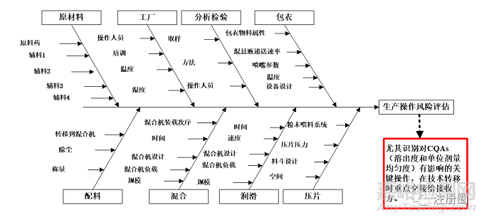 風險評估十分重要,有利于識別轉出方和接收方在設施設備、工藝、檢驗儀器、對產(chǎn)品理解等方面存在的差距,為后續(xù)轉移方案及控制策略制定提供依據(jù)。建議條件允許時采用面對面的交流評估方式,降低轉移雙方信息差,便于接收方更深入地理解產(chǎn)品和工藝性能,推薦采用魚骨圖,從物料、儀器設備、方法、人員、測量、環(huán)境等方面進行轉移評估,尤其需要識別出對CQAs有影響的CPPs,和接收方重點闡述說明,以某固體制劑項目轉移為例,其操作風險評估魚骨圖可采用下圖2方式呈現(xiàn):