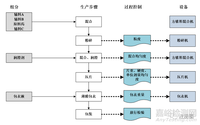 推薦采用框圖流程圖(含組分、生產(chǎn)步驟、過程控制、設備等),對待轉移產(chǎn)品及工藝進行可視化呈現(xiàn),便于接收方增強理解,如某片劑產(chǎn)品/工藝轉移的框圖流程圖示例如下: