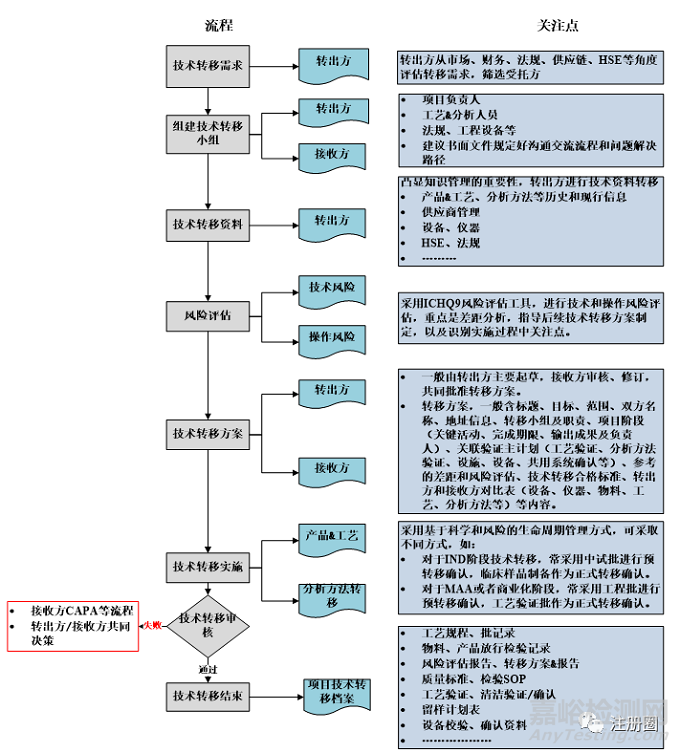 藥品技術轉移,首先需要確定技術轉移需求,然后轉出方和接收方共同組建技術轉移小組,進行后續(xù)的技術資料轉移、風險評估、撰寫技術轉移計劃/方案、實施技術轉移等工作,技術轉移一般流程及關注點見下圖1:
