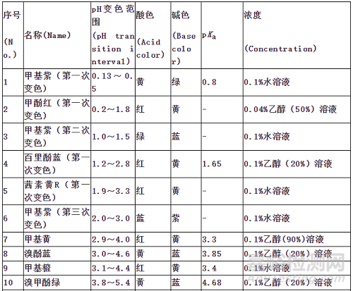 以甲基橙(Ka=10-3.4)為例,溶液的pH<3.1時,呈酸性,具紅色;ph>4.4時,呈堿性,具黃色;而在pH3.1~4.4,則出現(xiàn)紅黃的混合色橙色,稱之為指示劑的變色范圍。不同的酸堿指示劑有不同的變色范圍。