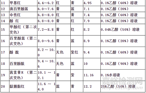 13、茜素磺酸鈉指示液:取茜素磺酸鈉0.1g,加水100mL使溶解,即得。變色范圍 pH3.7~5.2(黃→紫)
