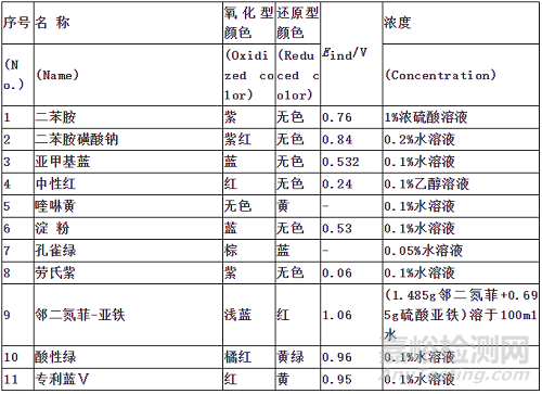 氧化還原指示劑用于氧化還原法容量分析。下表列出一些在教學(xué)和工作中經(jīng)常使用的部分氧化還原指示劑。