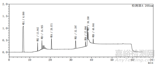 波長選擇需要注意的點:190~210nm這個范圍內(nèi)的波長慎重選擇,該波段的波長屬于低波段,受到的干擾比較多,尤其是受流動相中試劑的純度影響較大。如果遇到試劑不純或者水質(zhì)不好時,就會有一個類似梯度峰的“峰”出現(xiàn),此類峰往往比較平滑,并不像真正雜質(zhì)的峰那樣尖銳,同時表現(xiàn)為無論如何調(diào)整梯度洗脫程序,始終在特定的位置“出峰”。如果該“峰”恰巧影響雜質(zhì)出峰,那么消除起來就非常難了。筆者曾經(jīng)遇到的一個項目就被這種峰糾纏了好久,后來通過更換更高級別的試劑、更純凈的水、多次沖洗儀器、色譜柱,逐步排除后才解決問題,我曾試驗過,用DAD檢測器選用265nm、225nm、205nm分別作為檢測波長,該“峰”在265nm、225nm不會出現(xiàn),所以205這個波長慎重選擇。