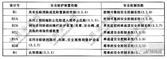 根據(jù)風(fēng)險評估表格中的定義,確定風(fēng)險降低的索引號,再從下表1確定安全防護(hù)裝置的性能和安全控制系統(tǒng)性能的最低要求。
