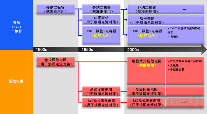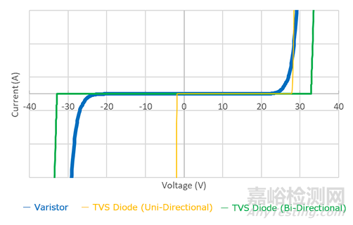 1968年開發(fā)的氧化鋅壓敏電阻用于保護二極管免受雷擊。另一方面,二極管主要用于整流,其用途不同。因此,產(chǎn)品目錄和數(shù)據(jù)表中記載的不同項目很多,現(xiàn)在也難以單純地進行比較。在Automotive Electronics Council(車載電子部件評議會)制定的規(guī)格中,AEC-Q101適用于TVS二極管,AEC-Q200適用于壓敏電阻,其內(nèi)容大不相同。