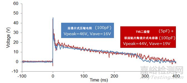 從盤型壓敏電阻等初期的壓敏電阻時的記憶中,壓敏電阻的反應(yīng)速度慢,經(jīng)常聽到這樣的話。但是,如下圖所示,貼片壓敏電阻和TVS二極管對施加過電壓的反應(yīng)速度一樣。施加IEC61000-4-2 HBM +8kV后,在1ns以內(nèi)達到峰值,400ns后施加在保護部件上的電壓值幾乎為0。