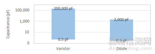 壓敏電阻和TVS二極管的靜電容量幅度大不相同。由于貼片壓敏電阻采用積層結(jié)構(gòu),所以可以通過增加內(nèi)部電極的層數(shù),增加靜電容量。用EIA0805以下的尺寸進行比較時,如下圖所示,靜電容量的最大值有近100倍的差距。因此,在必須并聯(lián)放入MLCC的線路中,也有可以用單個貼片壓敏電阻應(yīng)對的情況。