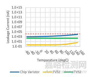 此外,靜電保護部件的漏電流具有溫度依賴性,還需要考慮實際使用時的溫度環(huán)境。下圖是典型的貼片壓敏電阻和TVS二極管的漏電流溫度特性。隨著高溫的升高,漏電流會變大,但設(shè)計時使之低于50uA。