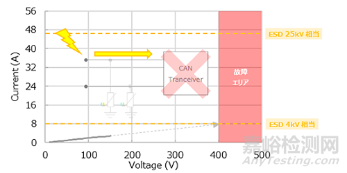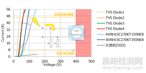 如果不使用靜電保護部件,4kV的靜電會導(dǎo)致8A電流流向CAN Tranceiver,CAN Tranceiver會損壞。另一方面,從以下圖可知,由于施加電壓,壓敏電阻、TVS二極管的電阻值急劇下降到2Ω以下。