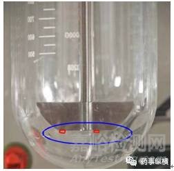 當(dāng)用槳法進(jìn)行溶出實驗時,有時會在槳的底部生成氣泡(見圖4,紅圈為氣泡示意圖),生成的氣泡吸附在槳上。若在實驗開始前發(fā)現(xiàn)生成氣泡,出現(xiàn)此情況可將槳提出液面,然后慢慢將槳再放回溶出介質(zhì)中即可排除槳底部的氣泡。