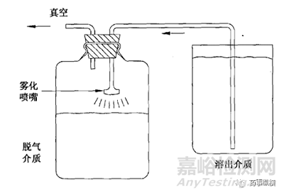 1978年FDA公布了令人滿意的脫氣方法,如圖5所示。該法在18~22英寸(汞柱)真空度下,通過霧化噴嘴將介質(zhì)霧化,介質(zhì)霧化后釋放溶解的氣體。將盛有介質(zhì)的容器密封,經(jīng)此法處理的溶出介質(zhì)可在2~3天內(nèi)供溶出實驗用。