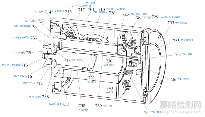 如圖所示,旋轉(zhuǎn)位置檢測器包括傳感器735以及隨動力輸出軸706一同旋轉(zhuǎn)的檢測件736。傳感器可以采用光電傳感器,并安裝在固定于后端蓋703內(nèi)側(cè)的圓盤737上。在所示實施例中,傳感器呈槽型光電傳感器的形式,包括兩個對置的槽壁,槽壁之一上設(shè)置有光發(fā)射器,另一個上設(shè)置有光接收器。檢測件736包括套筒部738以及從套筒部向后延伸的桿部739。在組裝狀態(tài)下,套筒部738套裝在電機外側(cè),并連同電機一起安裝在滑環(huán)轉(zhuǎn)子的孔740中,利用緊定螺釘將套筒部相對于滑環(huán)轉(zhuǎn)子固定,從而電機、套筒部以及滑環(huán)轉(zhuǎn)子作為一個整體一起旋轉(zhuǎn)。所述桿部739的徑向位置與傳感器735的徑向位置相對應(yīng),在動力輸出軸706轉(zhuǎn)動時,所述桿部隨同動力輸出軸706一起轉(zhuǎn)動,在經(jīng)過傳感器時,桿部的端部從傳感器的槽中通過,由此傳感器可以檢測動力輸出軸706從而驅(qū)動導(dǎo)絲旋轉(zhuǎn)的驅(qū)動軸的旋轉(zhuǎn)位置,并基于檢測結(jié)果控制驅(qū)動導(dǎo)絲旋轉(zhuǎn)的驅(qū)動軸復(fù)位。