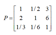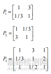 采用專家打分確定一級(jí)指標(biāo)B1、B2、B3的判斷矩陣:
