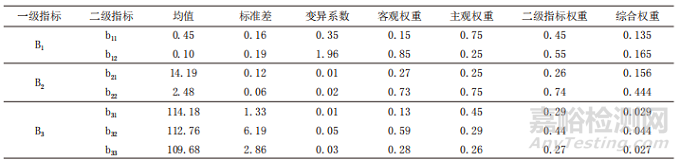 本文采用主客觀相結(jié)合的方法確定二級(jí)指標(biāo)的權(quán)重。客觀權(quán)重方面,若不同個(gè)體某項(xiàng)指標(biāo)的差異越大,則該指標(biāo)的權(quán)重越大。為了考慮各指標(biāo)量綱不同的影響,采用變異系數(shù)法確定各指標(biāo)的客觀權(quán)重。