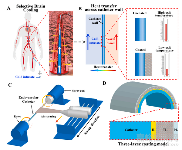 圖1.血管內(nèi)靶向低溫腦保護(hù)技術(shù) (A),導(dǎo)管內(nèi)低溫灌注液與導(dǎo)管外血液熱交換示(B),氣壓噴涂設(shè)備(C)和“界面IL-隔熱TL-保護(hù)PL”隔熱涂層體系示意圖