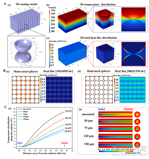 圖2 隔熱涂層內(nèi)多孔微球堆疊結(jié)構(gòu)與傳熱云圖(A);單一尺寸與雙尺寸微球堆疊結(jié)構(gòu)涂層熱通量云圖(B);不同涂層厚度下導(dǎo)管出口溫度模擬結(jié)果(C)