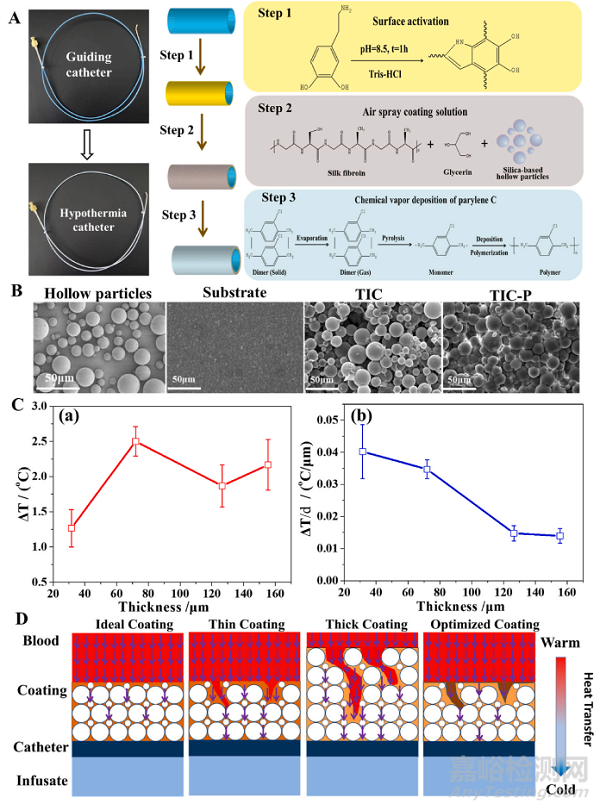 圖3 隔熱涂層制備流程圖(A);微米空心球與涂層掃描電鏡形貌照片(B);與裸導(dǎo)管相比,不同涂層厚度下導(dǎo)管出口溫度差值(C);涂層隔熱性能示意圖(D)