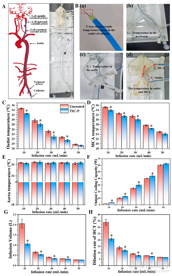 圖4 腦靶向低溫體外模擬平臺(tái)照片(A)和局部照片(B);導(dǎo)管出口溫度(C)、大腦中動(dòng)脈溫度(D)、主動(dòng)脈弓溫度(E)、輸出制冷功率(F)、灌注體積(G)與血液稀釋率(H)