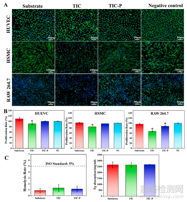 圖5 體外生物相容性分析。HUVEC, HSMC 與 RAW 264.7 細(xì)胞熒光染色照片(A)和細(xì)胞增殖率(B),以及血液相容性分析(C)