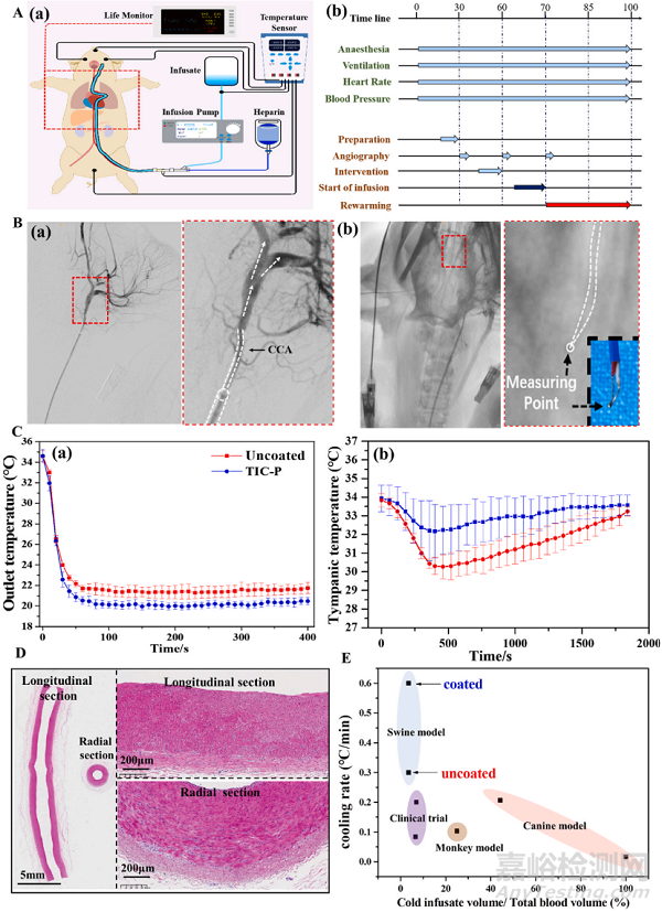 圖6 動(dòng)物實(shí)驗(yàn)裝置與流程示意圖(A),DSA影像照片(B),導(dǎo)管出口處灌注液溫度與同側(cè)耳溫(C),頸總動(dòng)脈切片HE染色(D)與降溫速率對(duì)比(E)