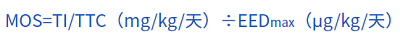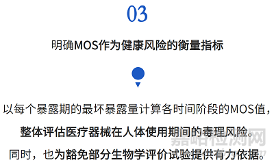 MOS作為健康風(fēng)險(xiǎn)的衡量指標(biāo),MOS值可以根據(jù)每個(gè)暴露期的最壞暴露量與TI或TTC進(jìn)行比較所得,當(dāng)MOS>1.0認(rèn)為化合物的暴露量對(duì)健康沒有明顯的危害。否則,需要參照 ISO 10993-1[3]和 ISO 14971[4]進(jìn)行進(jìn)一步的毒理風(fēng)險(xiǎn)分析及毒理評(píng)估。