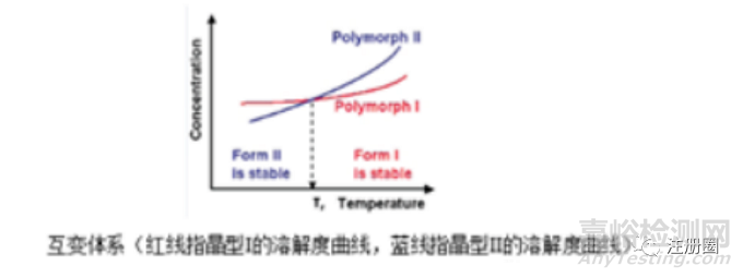 原料藥晶型不同也會影響到析晶工藝的選擇,如選擇合適的析晶溶劑、析晶溫度、析晶時間和析晶操作條件。在單變體系下,不同的晶型在同一溫度下溶解度差異較大,此時若目標(biāo)晶型為穩(wěn)態(tài)晶型,則需要在結(jié)晶工藝中采取措施使亞穩(wěn)態(tài)晶型向穩(wěn)態(tài)晶型轉(zhuǎn)變,具體措施包括結(jié)晶后期增加循環(huán)升降溫打漿或適當(dāng)延長結(jié)晶操作時間;若目標(biāo)晶型為亞穩(wěn)態(tài)晶型,則需要加入足夠量的晶種,因晶種能提供足夠的生長面供晶體生長,避免“自發(fā)成核”從而生成混晶。另外,制備亞穩(wěn)晶型,需要考察溶劑介導(dǎo)轉(zhuǎn)晶的影響。質(zhì)量合格的情況下,盡量減少結(jié)晶時間,若結(jié)晶時間較長,亞穩(wěn)態(tài)晶型易向穩(wěn)態(tài)晶型轉(zhuǎn)變;在互變體系下,晶型可以在一定條件下相互轉(zhuǎn)變。此時溫度是結(jié)晶工藝的關(guān)鍵參數(shù),如下圖,在溫度小于晶型轉(zhuǎn)變溫度(Tr)時,晶型II是穩(wěn)定晶型(溶解度更低),晶型I是亞穩(wěn)晶型,此時制備晶型II更容易;反之,在溫度T>Tr,晶型I是穩(wěn)定晶型,晶型II是亞穩(wěn)晶型,此時制備晶型I更容易。