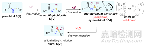 目前,手性六價(jià)硫衍生物得制備方法主要包括:以手性亞砜、手性亞磺酰胺,或者手性硫亞胺為底物進(jìn)行不對(duì)稱轉(zhuǎn)化;以對(duì)稱性的砜亞胺為底物,通過催化對(duì)映選擇性去對(duì)稱化策略,制備各種類型手性砜亞胺衍生物。這些方法受限于手性底物的制備,或者對(duì)稱性砜亞胺底物的制備,因此缺少比較通用的制備手性六價(jià)硫衍生物(包括砜亞胺、氯代砜亞胺、氟代砜亞胺、砜亞胺酰胺、砜亞胺酯)的方法。研究以潛手性次磺酰胺為底物,通過連續(xù)兩次氧化氯代生成對(duì)稱性的二氯代砜亞胺陽離子中間體。該中間體與手性磷酸根形成離子對(duì),通過對(duì)映選擇性地去對(duì)稱水解,得到手性氯代砜亞胺(圖2)。