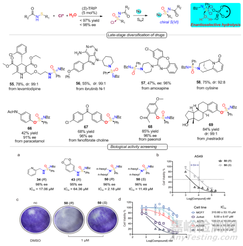 手性氯代砜亞胺可以作為通用的合成子,制備各種手性六價(jià)硫衍生物(圖3)。該方法可有效地將藥物中胺基官能團(tuán)轉(zhuǎn)化為砜亞胺酰胺,酚羥基轉(zhuǎn)化為砜亞胺酯。同時(shí),研究通過活性篩選發(fā)現(xiàn),手性砜亞胺酰胺類具有廣泛的抗腫瘤活性。相關(guān)研究成果以Synthesis of Chiral Sulfonimidoyl Chloride via Desymmetrizing Enantioselective Hydrolysis為題,發(fā)表在Journal of the American Chemical Society上。研究工作得到中科院青年創(chuàng)新促進(jìn)會(huì)、中科院“西部之光”人才培養(yǎng)計(jì)劃、四川省的支持。