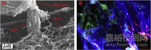 圖2 交織在一起的血栓纖維蛋白和NET網(wǎng)